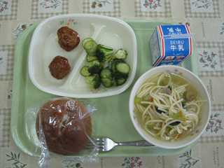 (今日は、ライスボール・コンソメスパゲッティー・スコッチエッグ・ブロッコリーサラダでした。)