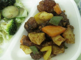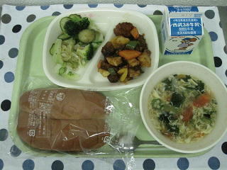 2日(木)の給食 豚肉と鶏レバーのマリアナソースがけ