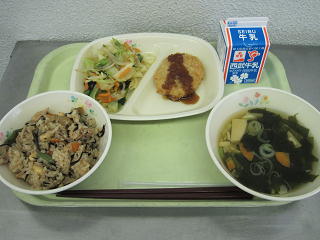ひじき入りご飯 コロッケ からしあえ若竹汁 牛乳若竹汁には、わかめとたけのこが入っています。たけのこの美味しい季節になりました。若竹汁は、たけのこの代表的な料理です。たけのこは、”竹”の”子”だということをご存知でしょうか。春先、地面から芽の出かけているものを”たけのこ”と呼びます。それが数メートル伸びると、立派な”竹”になります。