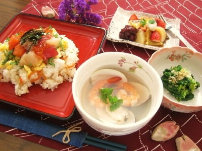 ひな祭りの料理はやはり、ちらし寿司と蛤のお吸い物ですね。ちらし寿司の具である蓮(れんこん)