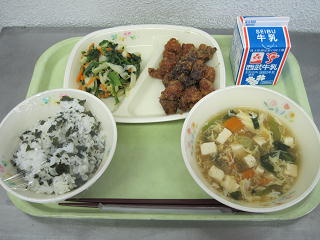 わかめご飯 豚肉のゴマダレ ほうれんそうあえかきたま汁 牛乳豚肉のゴマダレには、豚モモ肉と豚レバーを使っています。下味した肉を揚げて、しょうゆ、みりん、砂糖、すりごまでタレを作り、お肉と絡めます。とても生徒に人気のある給食なので、レバーが苦手な生徒でもおいしく食べてもらえる料理です。
