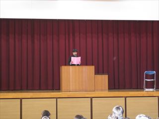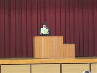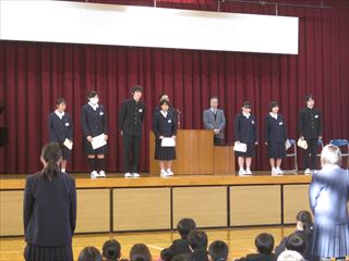 内容は、各学年の代表生徒の意見発表の後に、校長先生のことばがあり、校歌斉唱を