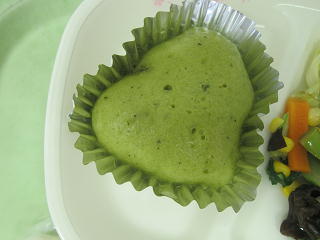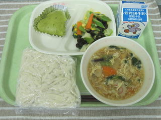山菜うどん 抹茶パンケーキ アスパラソテー 牛乳