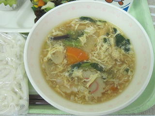 <山菜入り卵うどん> <アスパラソテー>