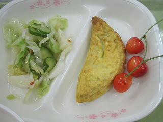 今日の給食のデザートは、旬の山形県産のさくらんぼです。