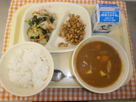 今日のチキンカレーライスに、学校でとれたさつま芋を入れました。