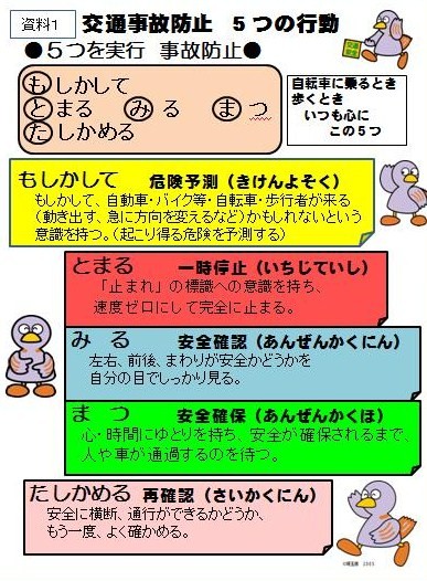 4月23日に、京都府において、登校途中の児童の列に無免許運転の暴走車が衝突し、児童と引率の保護者の命が失われ、多くの児童が重軽傷を負うという痛ましい交通事故が発生いたしました。この点から、県教委・市教委より「交通事故防止の徹底」について指示がありました。 本校としても、生徒の安全確保の視点から、一昨日より登下校時での立哨指導を行っております。 特に、通学路の安全確認及び交通事故防止「5つの行動」(もしかして・とまる・みる・たしかめる)を重点項目としています。