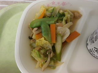 アスパラガス、春キャベツ、キヌサヤなどを入れて炒めます。