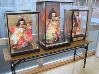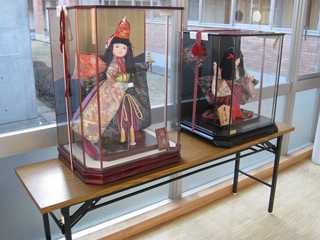 図書館前廊下に、「日本人形」を飾りました。