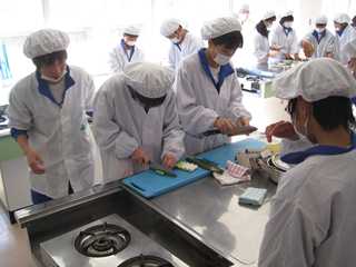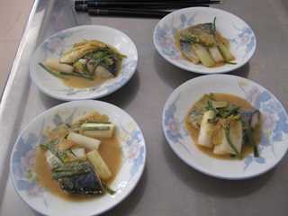 各班毎に、決められた係り分担で実習を行っていました。ショウガやネギを切ったり、サバ