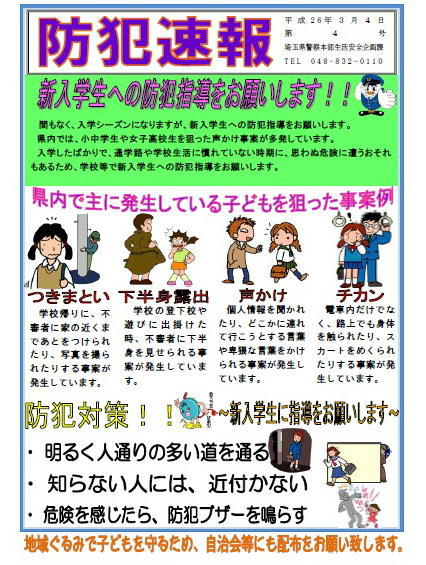 埼玉県警本部生活安全企画課より、防犯速報<第4号> ~新入生へ