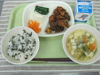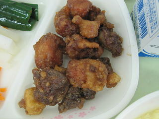 26日(火)の給食 豚肉と鶏レバーのゴマダレ
