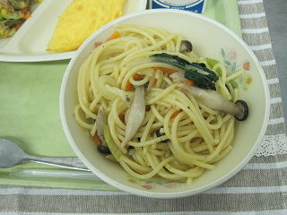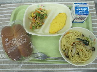 黒パン ペペロンチーノ ツナサラダ オムレツ 牛乳