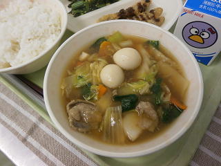 今日のうま煮丼は具材たっぷりです。野菜・肉・魚介類が
