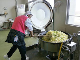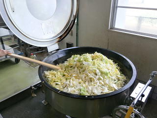回転釜からあふれるほどの白菜ですが、火を入れて混ぜると半分ほどになります。