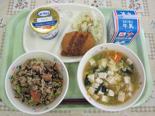 ひじき御飯、きのこクリームコロッケ、添えキャベツ、かきたま汁、デザート、牛乳