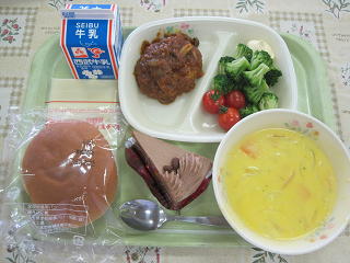 チーズハンバーガー、パンプキンポタージュ、ブロッコリーとミニトマト、ケーキ、牛乳