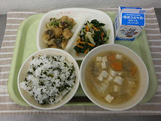 <鶏肉のふっかちゃん塩ダレ> <こんぶ茶が隠し味>今日は3年生が市長と対話会がありました。深谷市のマスコットキャラと