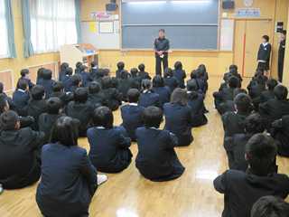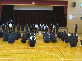 担当の生徒が司会を行い、連絡事項などを伝えてから先生方のお話を聞きました。学校生活での事や修学旅行についての