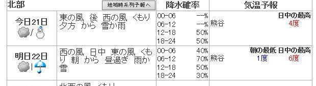 21日は、気圧の谷の影響で、埼玉県は曇りで、次第に雪や雨となる