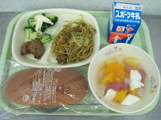 黒パン、インディア焼きそば、つくね、ブロッコリー、フルーツ杏仁ポンチ、牛乳
