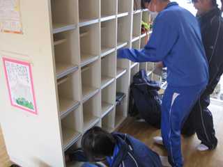 教室のワックスがけをする美化委員のみなさん 保護者用下足箱を掃除する生徒のみなさん
