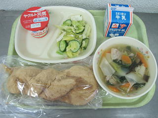 きなこ揚げパン、わんたんスープ、いかのマリネ、ヨーグルト、牛乳