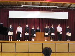 本日、体育館にて表彰朝会を行いました。