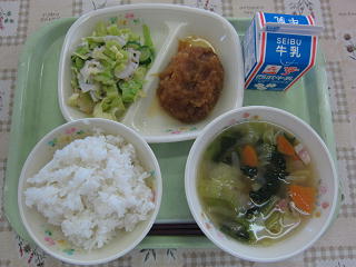 ごはん、和風おろしハンバーグ、れんこんサラダ、野菜コンソメスープ