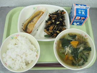 御飯、秋鮭の味噌マヨ焼き、大豆の磯煮、ちゃんこスープ、牛乳