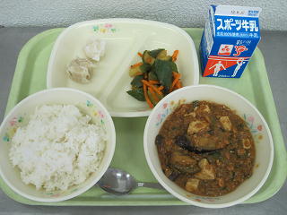 御飯、マーボーナス豆腐、しゅうまい、きゅうりとにんじんのピリット漬け、牛乳