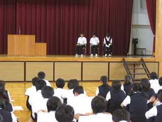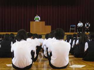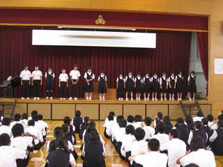 各種表彰を行った後、終業式では、各学年代表の小林さん(1年),茂呂さん(2年),佐藤さん(3年)の3名から1学期をふり返っての意見発表がありました。3名ともに、大変素晴らしい発表で、2学期へのしっかりとした決意も含まれていました。