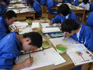 色について有彩色と無彩色のあることを知り、色相や明度、彩度など学び、実際に「十二色相