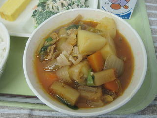 いつもの肉じゃがにキムチが入っています。あまり辛くなく、