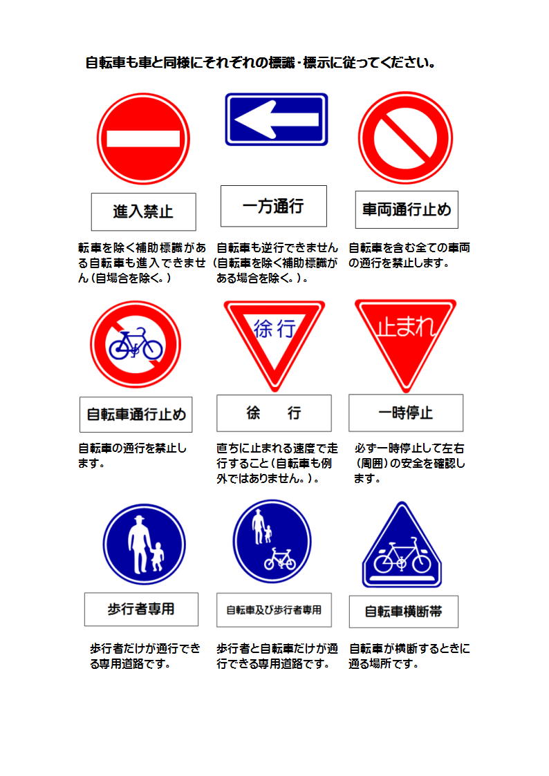 自転車も車と同じ扱いですから、自転車を乗る人は、標識は知っておいてください。