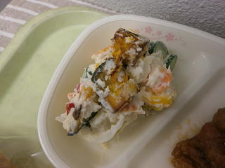 <カボチャ入りポテトサラダ>今日はクリスマス&冬至献立です。12月22日は冬至ですね。