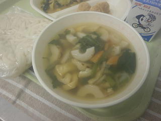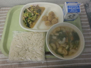 五目うどん 白玉団子のきなこあえ 青菜ソテー