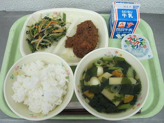かつ丼、ごまあえ、若竹汁、ゼリー、牛乳