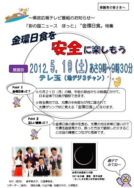 テレビ埼玉で、5月19日(土)午前9時から9時30分の「彩の国ニュースほっと」の中で、安全に金環日食を楽しむ方法について説明があります。是非、視聴して観察の参考にしてください。