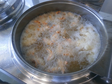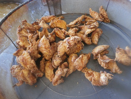 鶏肉につけて、高温で揚げます。カラッと揚がった