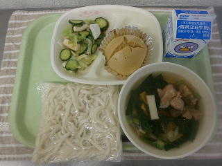 沖縄風ソーキそば 黒糖パンケーキ 海の幸サラダ 牛乳