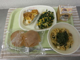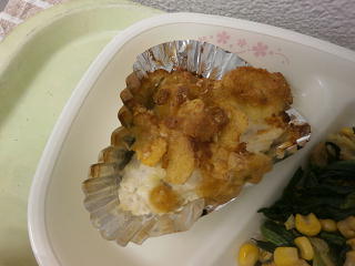 チキンのフレーク焼き 青菜ソテー 牛乳