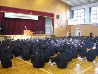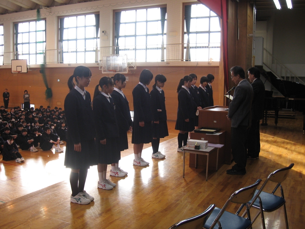 本日、2学期の終業式を行いました。各学年の代表生徒による「2学期のまとめ」の言葉がありました。発表した、1年生・金子さん、2年生・岡崎さん、3年生・和佐田さんからは、それぞれのこの2学期を通しての感想とともに新学期や受験への決意が述べられました。大変よくまとめられた発表でした。どうもありがとうございました。
