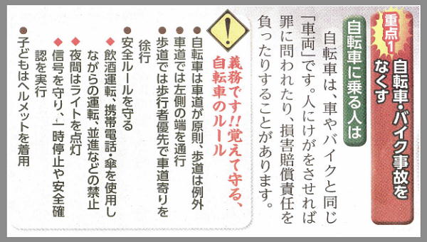 自転車が関係する交通事故死傷者数(今年1月から10月末)が、9,975人(内33人が亡くなっている。)にも上る事が書かれてあります。