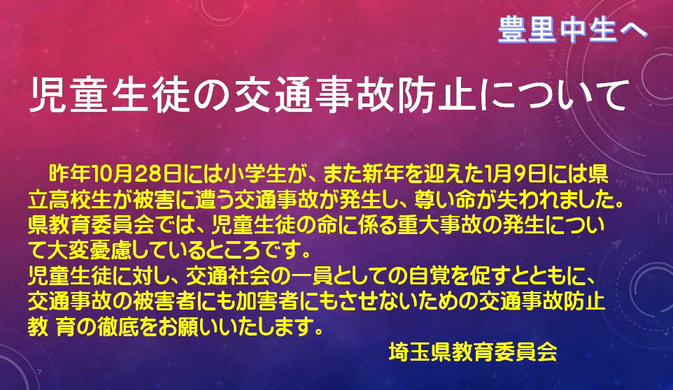 について」の連絡が入りました。特に、県内での児童生徒の交通事故が増えて