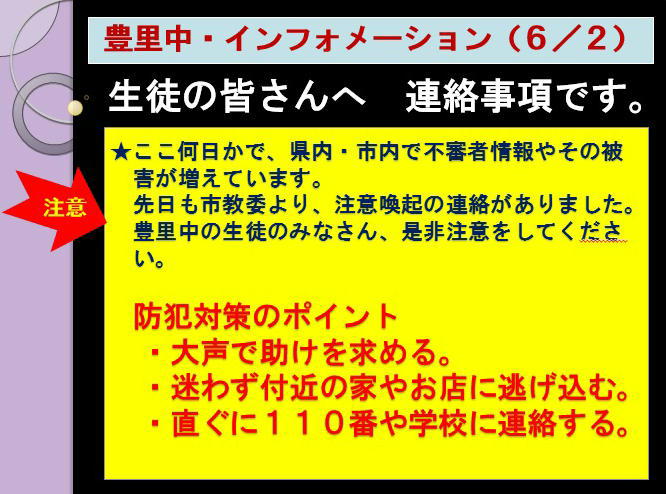 内容は、県内・市内で不審者が増えているので生徒への注意喚起を行うよう
