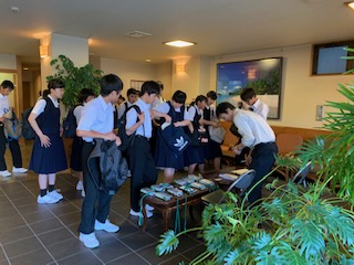 健康チェックをし、朝ごはんを食べ、みんな元気に班別行動に出発しました。(8:00)