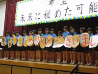 3年生を送る会が、明後日(6日)に行われます。1・2年生を中心に3年生へのお礼を込めて開く会です。今、その出し物で放課後等で練習をしています。是非、心温まる送る会にしましょう。今回のスローガンは、「飛躍 ~未来の扉を今開こう~」です。
