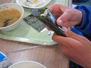 給食では「かてめし」を海苔に巻き、「恵方巻き」のように食べます。