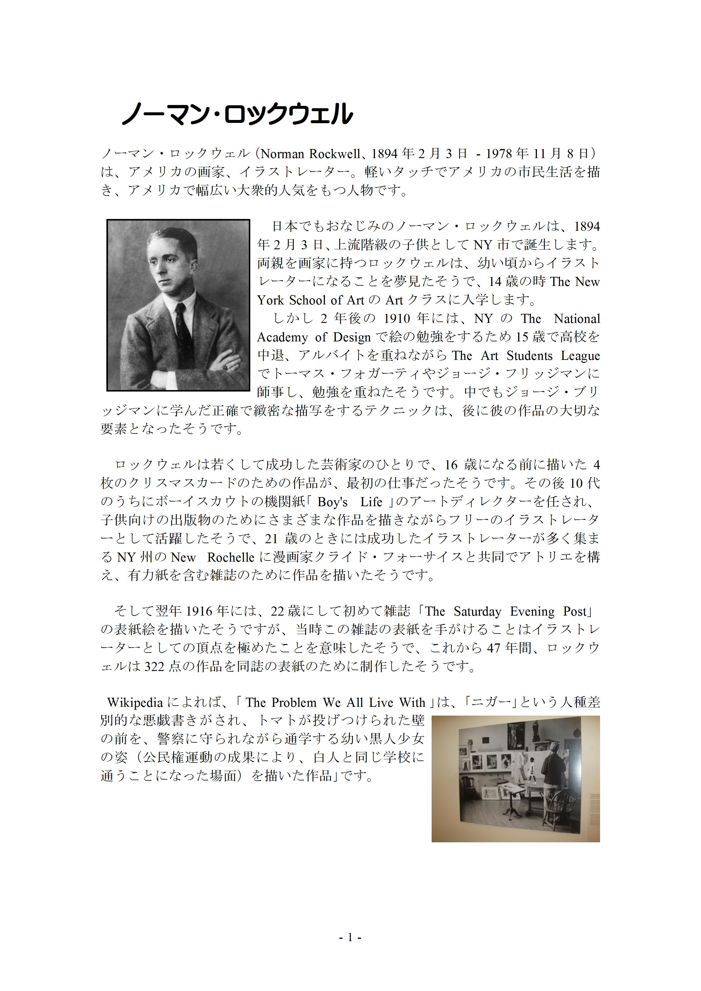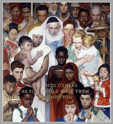 アメリカ・ニューヨークの国連本部ビルに、下の絵画をモザイク画にしたものが展示されています。 (この絵は、アメリカの有名な画家ノーマン・ロックウェルが書いた作品です。この絵もとに国連創 立40年を記念して1985年に、当時の大統領夫人であったナンシー・レーガンが、モザイク画と して寄贈したものです。) この絵の題は、「The Golden Rule(黄金律)」とされています。黄金律とは、多くの宗教、道徳や 哲学で見出される「他人にしてもらいたいと思うように行為せよ」という考え方のことであり、ロッ クウェルが、黄金律が世界中の主な宗教すべてに共通なテーマであることを訴えたいと、尊厳と 尊敬を込めてすべての民族、信教、人種を描いたとされています。特に、絵の中には、 Do unto others as you would have them do unto you. (己の欲するところを人に施せ) と書かれています。 豊里中のみなさん、是非、自分が他人からしてほしいと思うようなことを、他の人々にもしてあげてくだ さい。そして、これから君たちの周りの人々はもちろんのこと、世界の人々と友だちとなり、心豊かで幸 せな生活を過ごしましょう。 さて、有名な画家「ノーマン・ロックウェル」について簡単にまとめましたので御覧ください。 → page1.jpgpage2.jpg